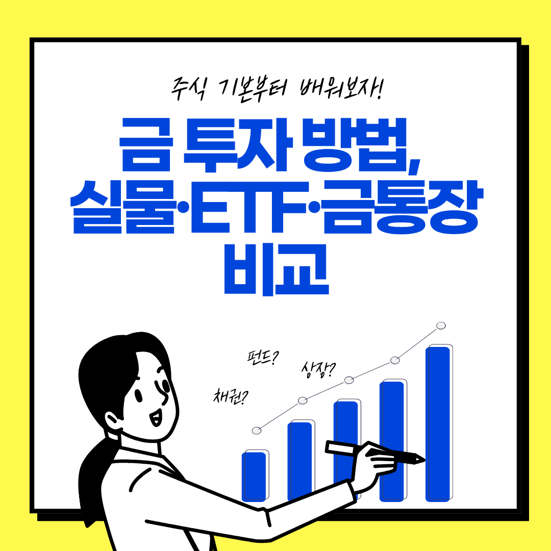 금 투자 방법을 실물 금, 금 ETF, 금 통장으로 비교 정리했습니다. 주식 초보자도 이해하기 쉽게 장단점, 세금, 투자 전략을 설명한 금 투자 가이드입니다.